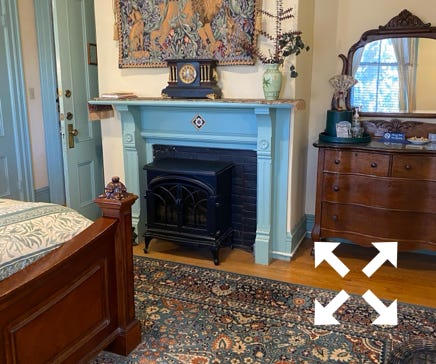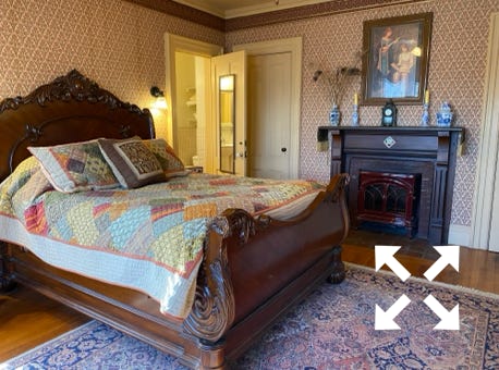 This second-floor bedroom is at the front corner of the home. It has a Queen and Twin Bed with an ensuite bathroom with shower. This bedroom features William Morris design elements and has an electric fireplace.
