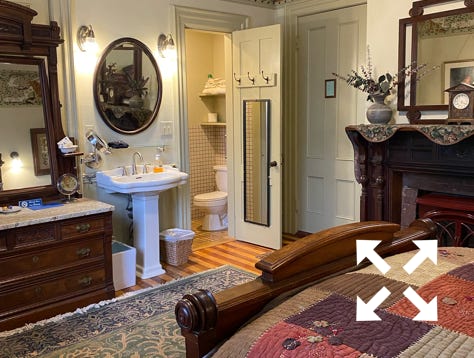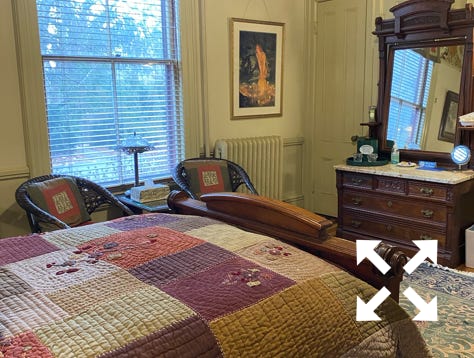 This second-floor bedroom at the front of the house has a Queen bed with detached private bathroom with a shower. This room is adjoined to Emily’s room via a locked interior door.