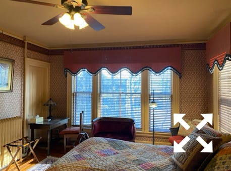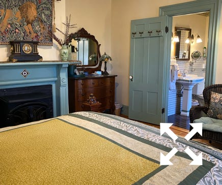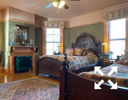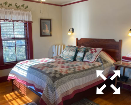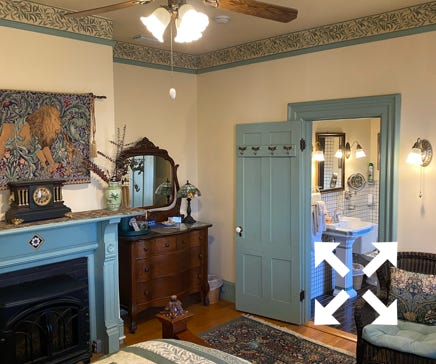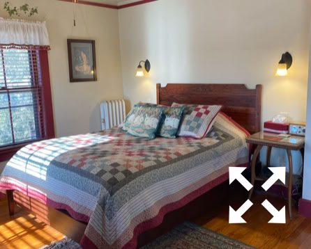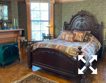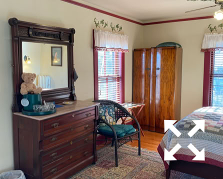 This second-floor bedroom is at the front corner of the home. It has a Queen and Twin Bed with an ensuite bathroom with shower. This bedroom features William Morris design elements and has an electric fireplace.