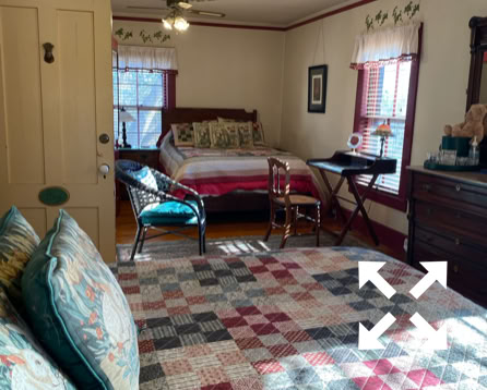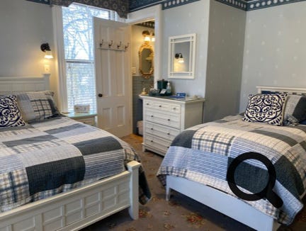 This second-floor bedroom at the front of the house has a Queen bed with detached private bathroom with a shower. This room is adjoined to Emily’s room via a locked interior door.