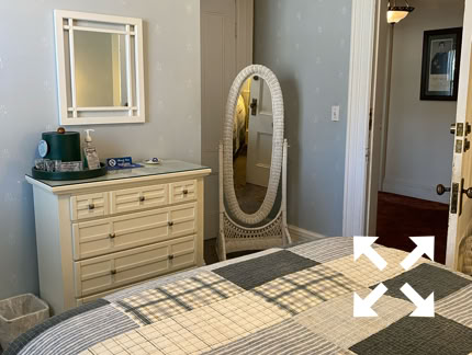 This second-floor bedroom at the front corner of the home features a Queen and Twin bed and an ensuite bathroom with shower. This room is adjoined to Austin’s room via a locked interior door. Maximum occupancy: 3